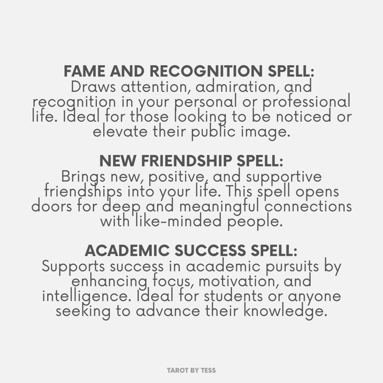 – Fame and recognition spell: Attract attention and acknowledgment for your talents.
