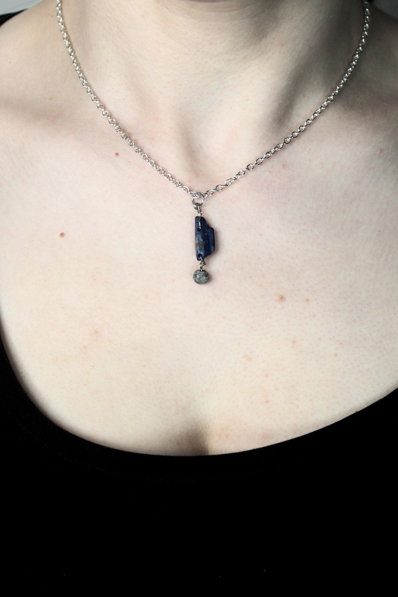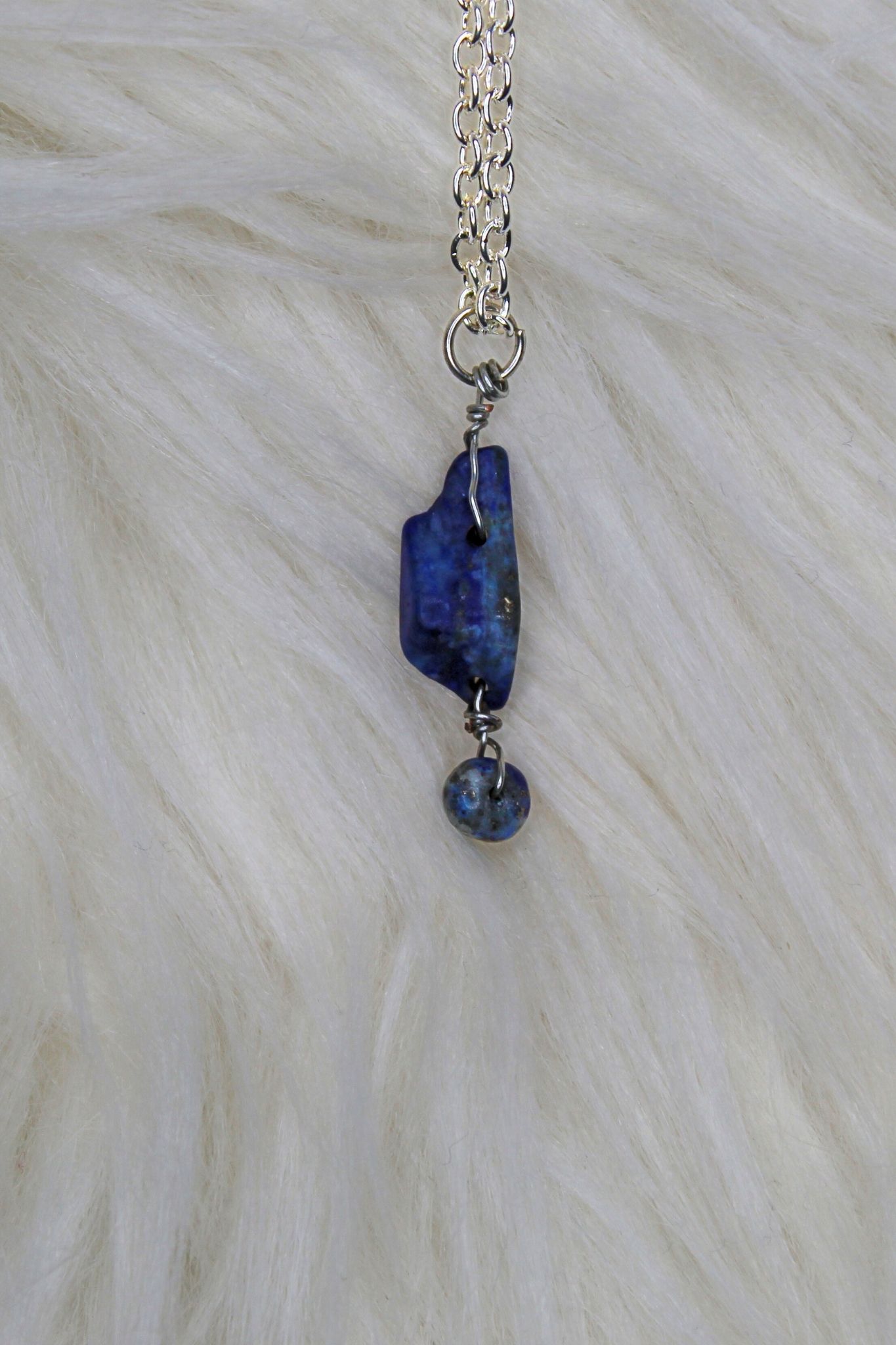 This pendant is handmade by me. It has two natural stones wrapped with silver wire. The top stone is jagged and irregular, a deep blue lapis lazuli with tiny gold flecks. The bottom stone is smaller and round, also blue but with some white spots.