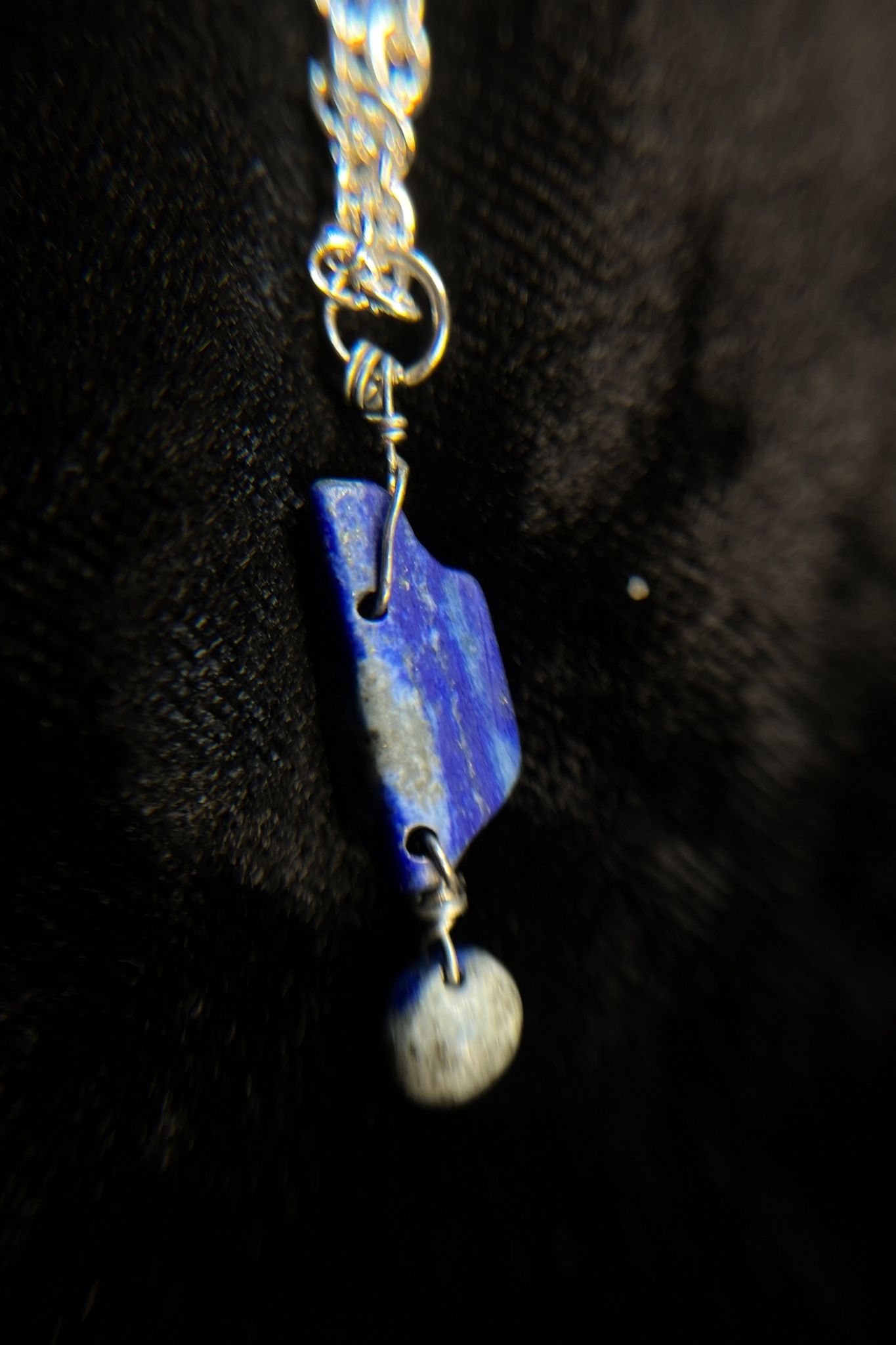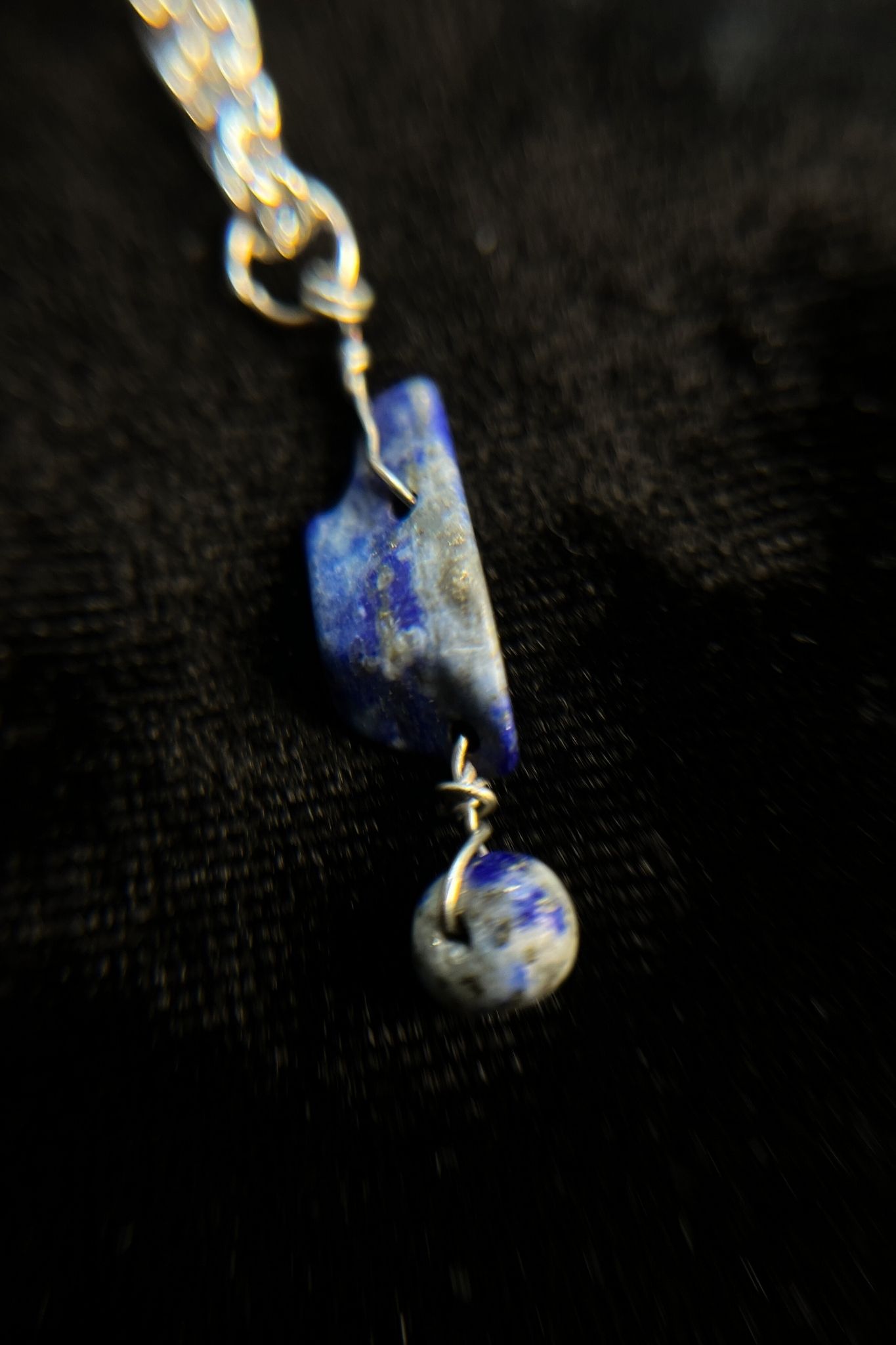 - Materials: Silver-colored wire, natural lapis lazuli stones, silver-coated chain