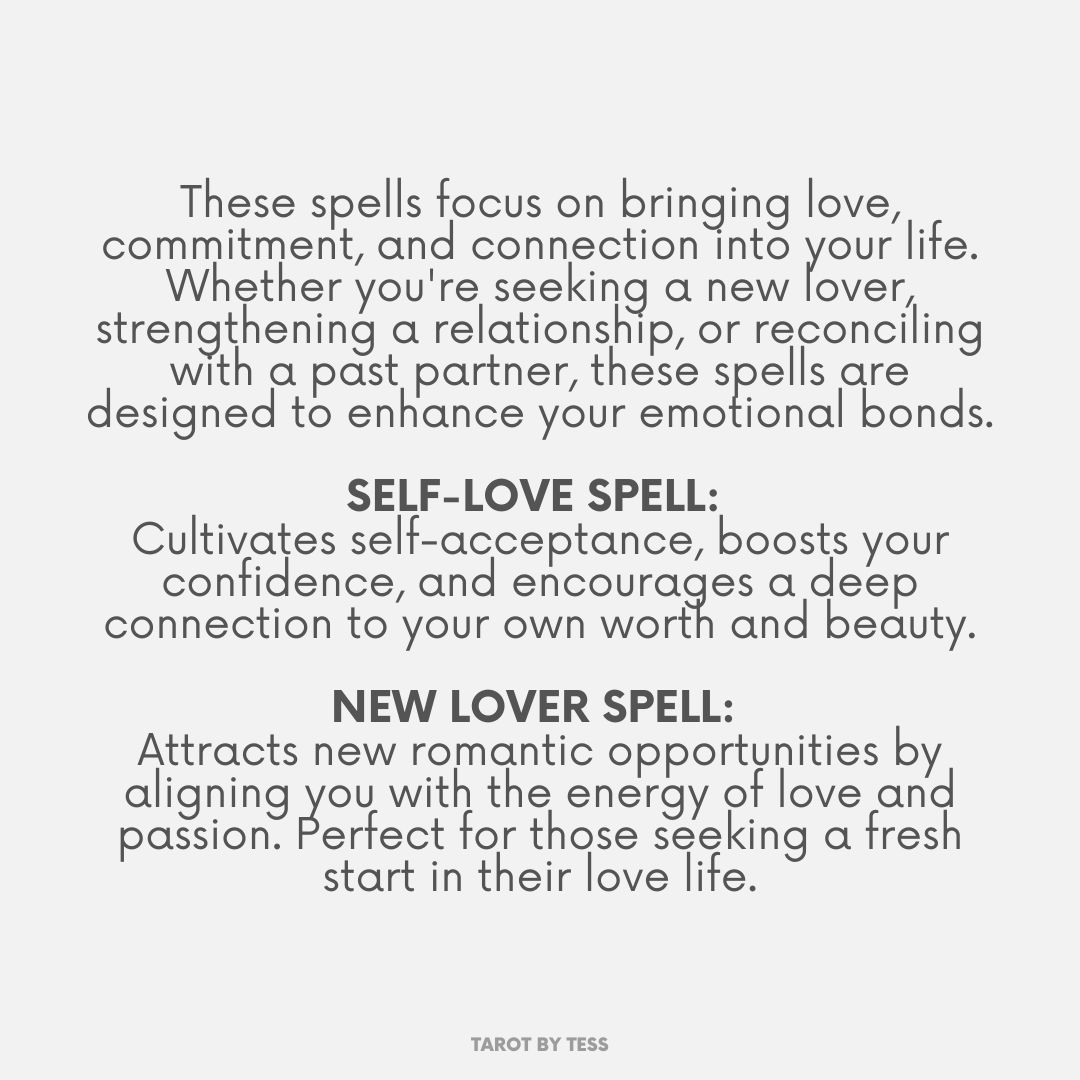– Self-love spell: Cultivate self-compassion and appreciation.