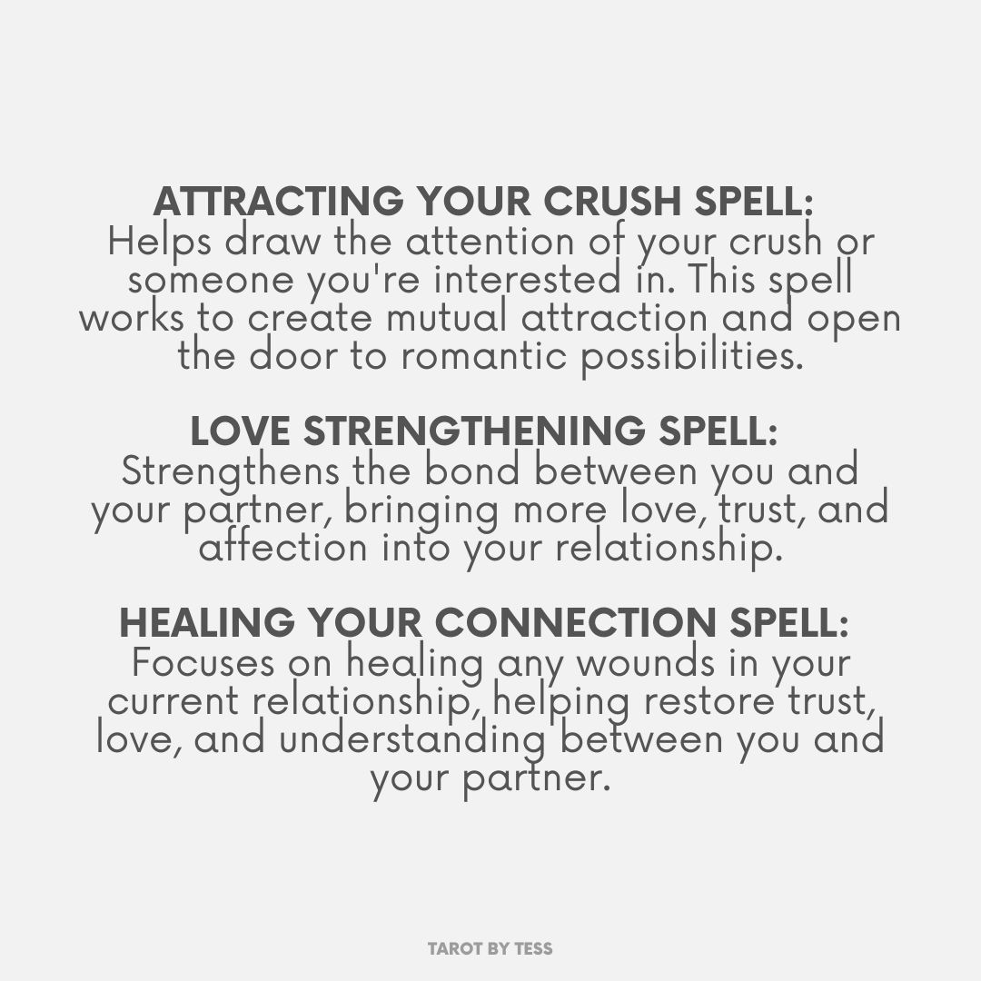 – Love strengthening spell: Deepen and strengthen your current relationship.