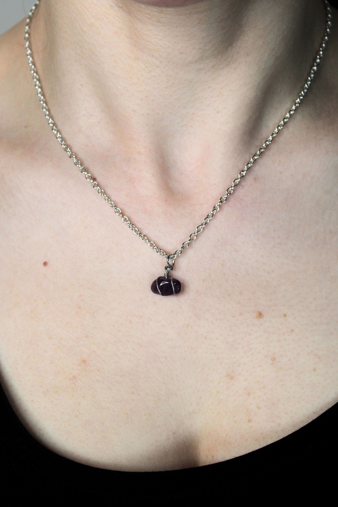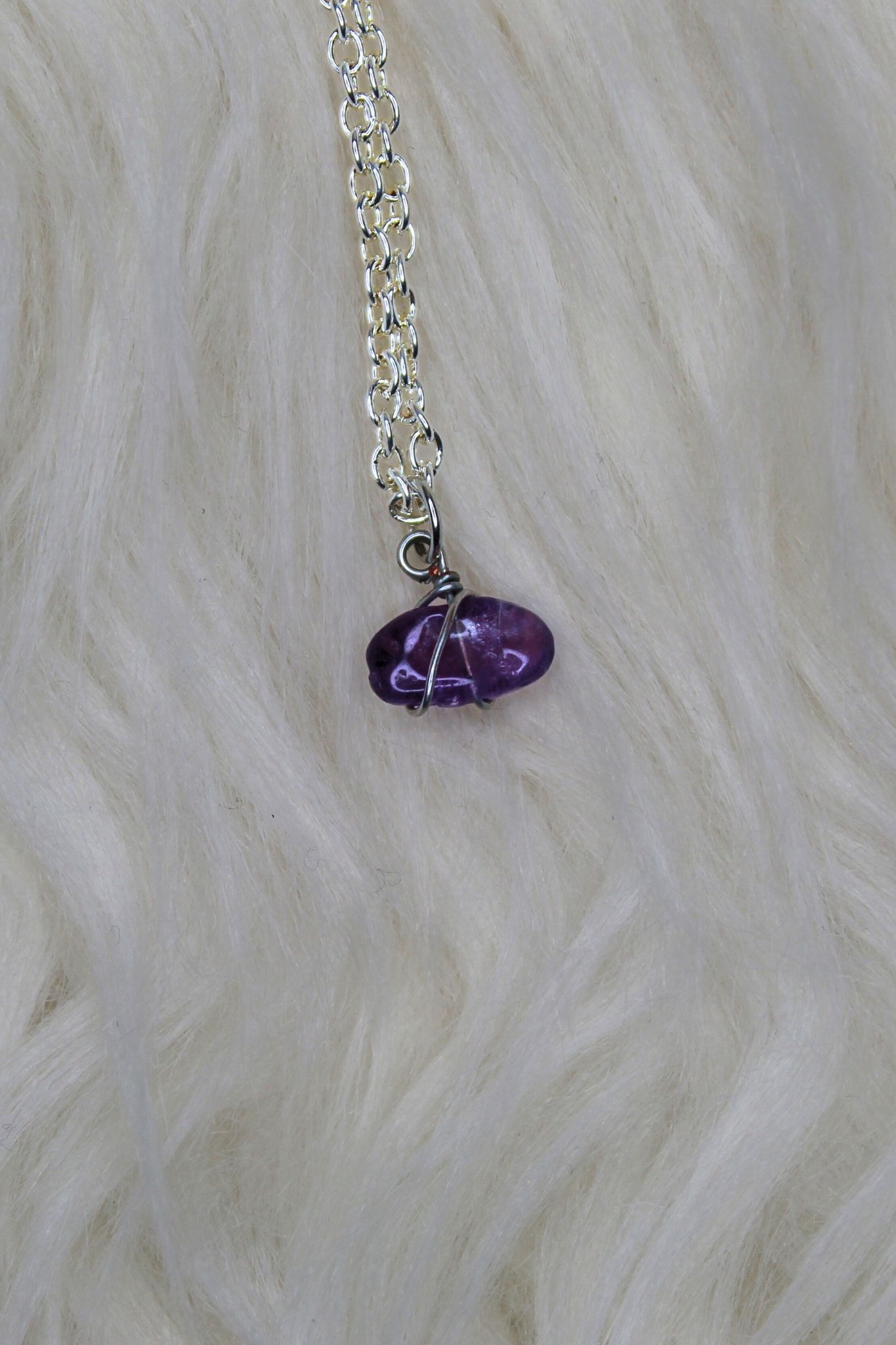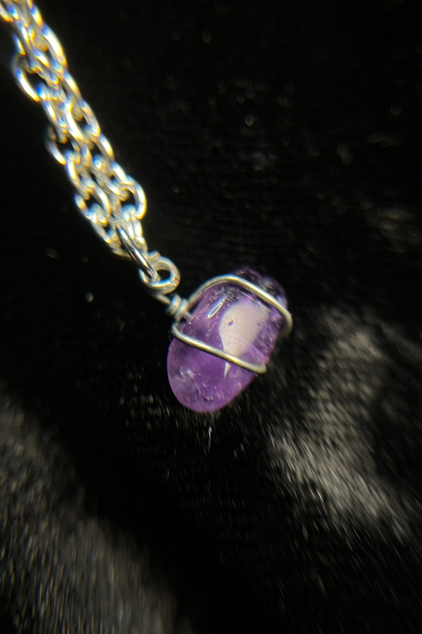 - Materials: Silver-colored wire, natural amethyst stone, silver-coated chain