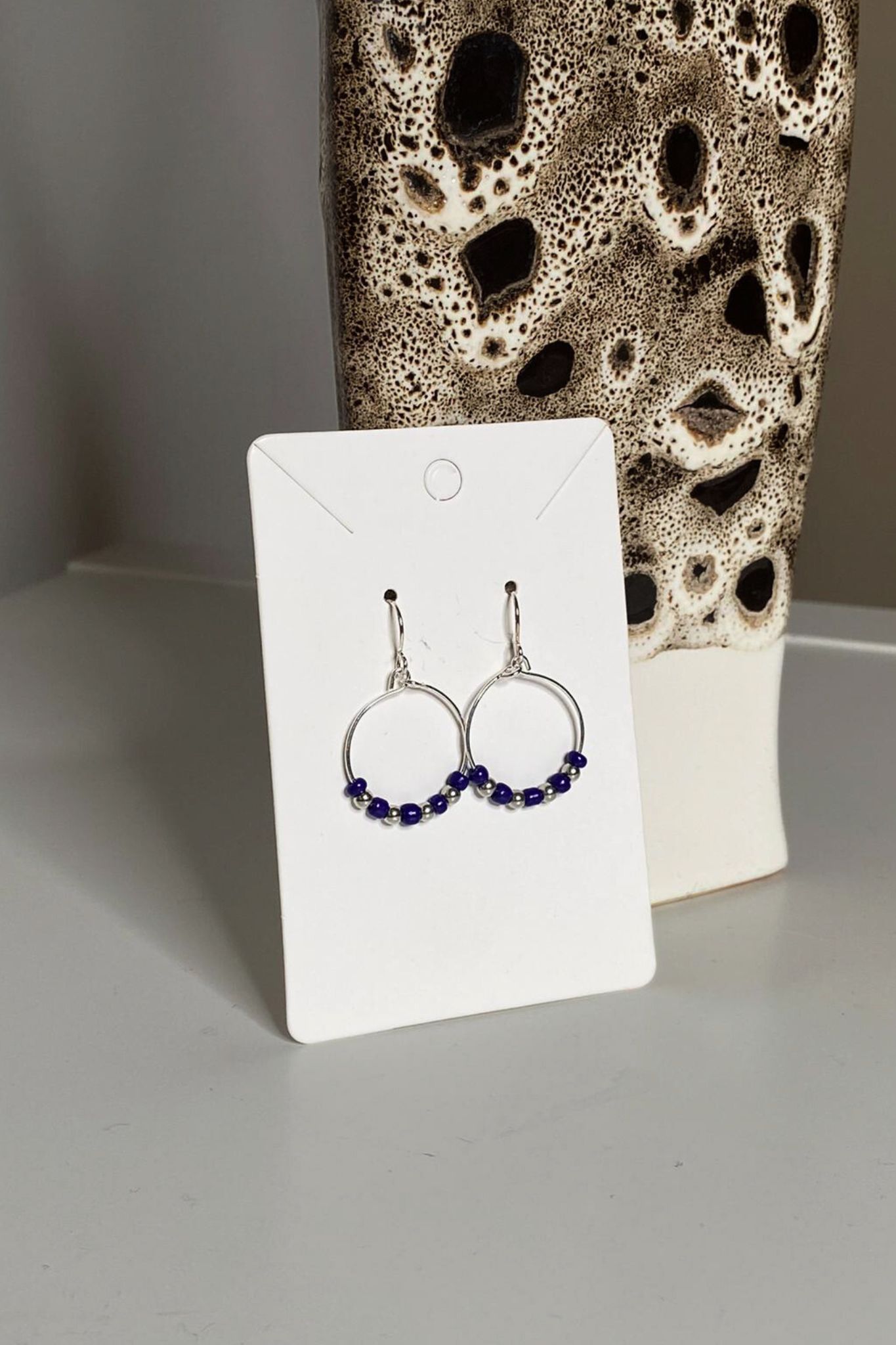 These earrings are handmade by me. They have a silver hoop with dark blue beads around the hoop, giving a deep and elegant color. The design is simple, modern, and stylish. You can wear them every day or for special occasions.