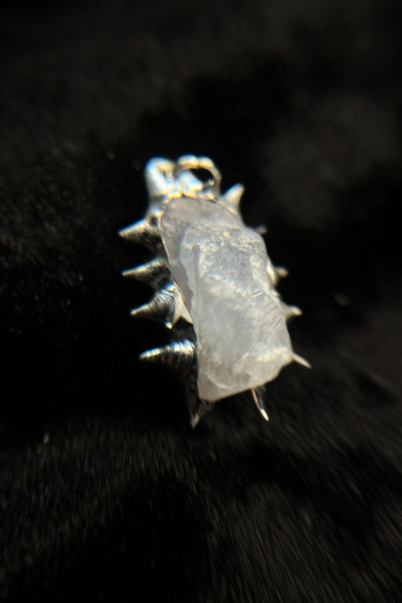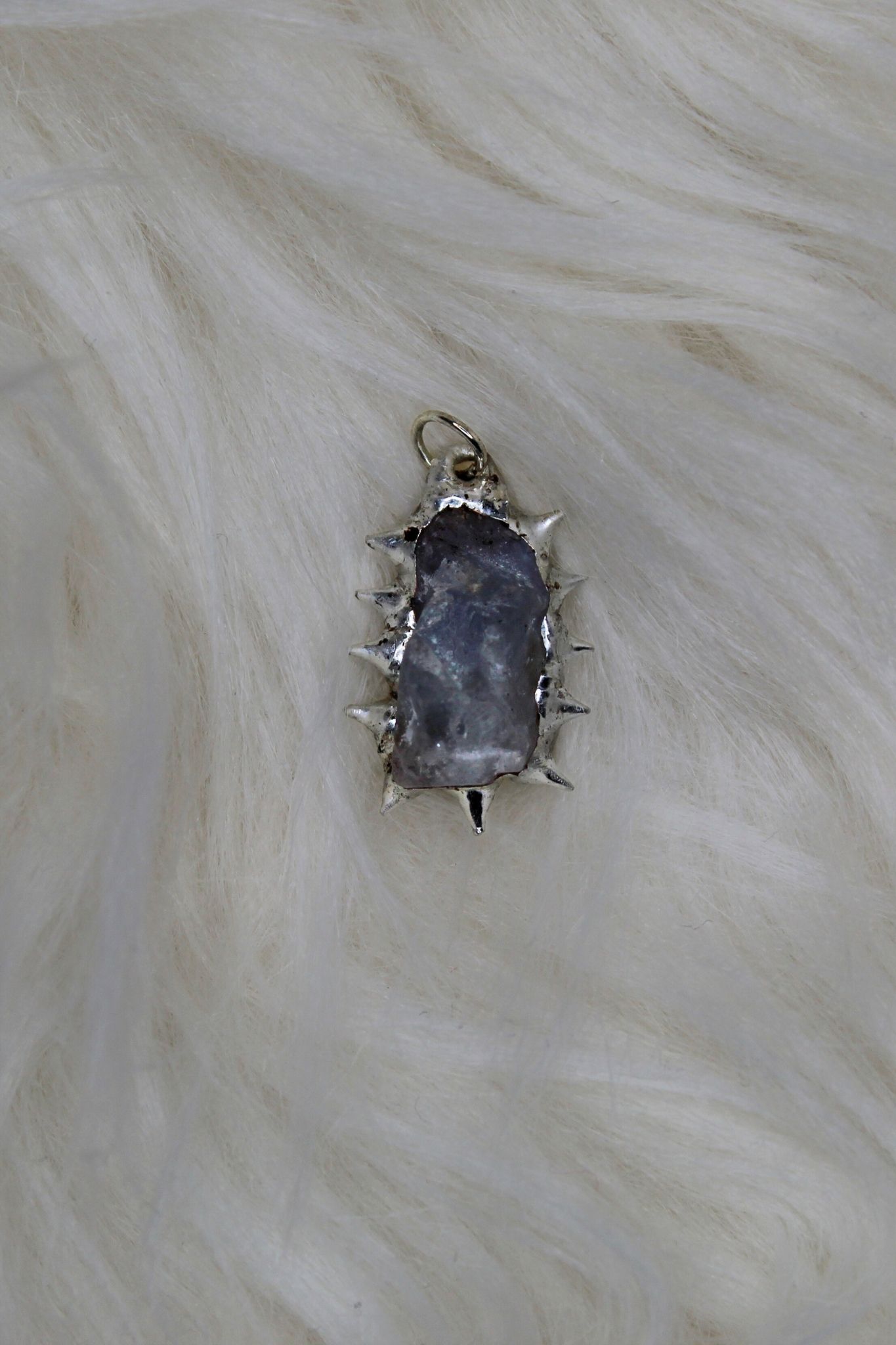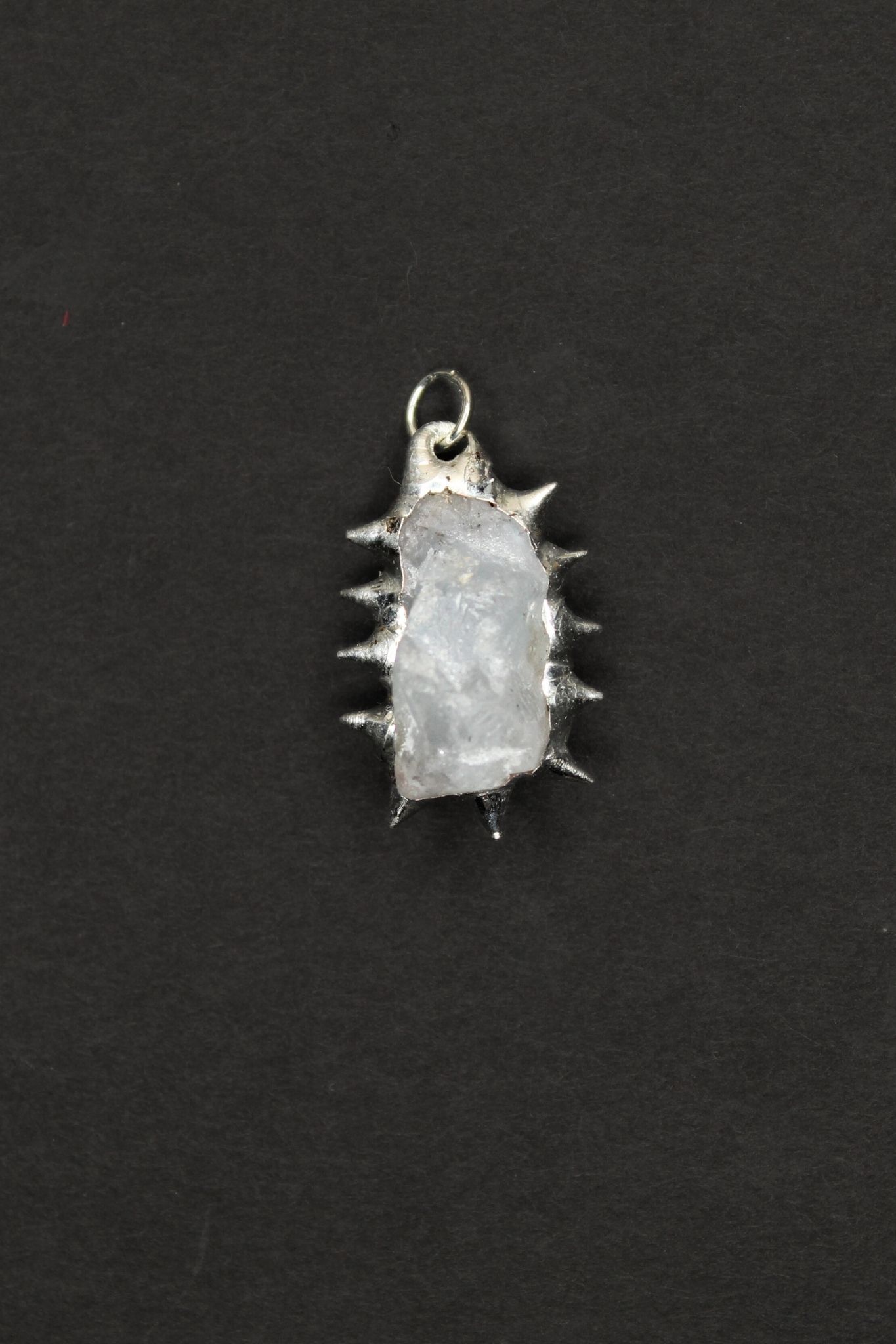 In the middle is a raw, translucent, milky stone. The stone has a frosted surface with a slight shimmer. Its irregular shape makes it look natural and unique. Around the stone are sharp silver spikes. The spikes point outward and give the pendant a strong, edgy look. The polished silver contrasts nicely with the soft, milky stone. Every pendant is a little different because it is handmade. No two are exactly the same.