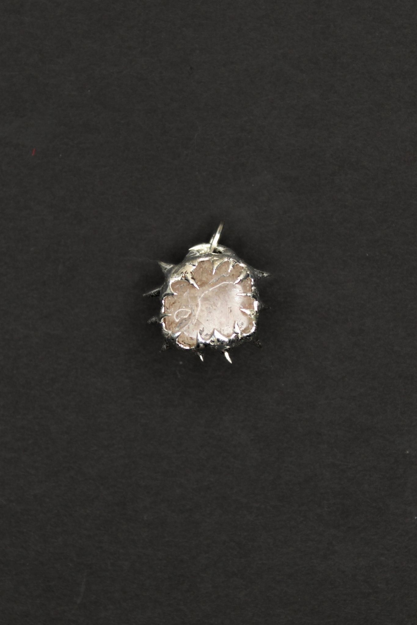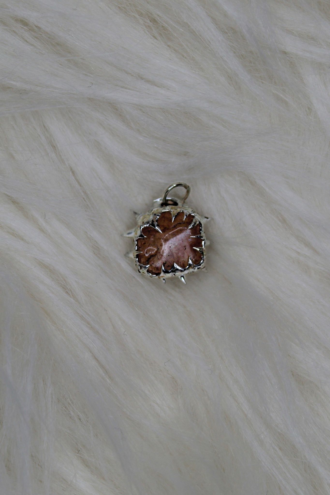 In the middle is a raw, opaque stone. The stone is soft peach or light brown in color. It has a matte, almost frosted surface. Around the stone are silver spikes. The spikes point outward and give the pendant a strong, slightly rebellious look. The polished silver contrasts nicely with the soft matte stone. Every pendant is a little different because it is handmade. No two are exactly the same.