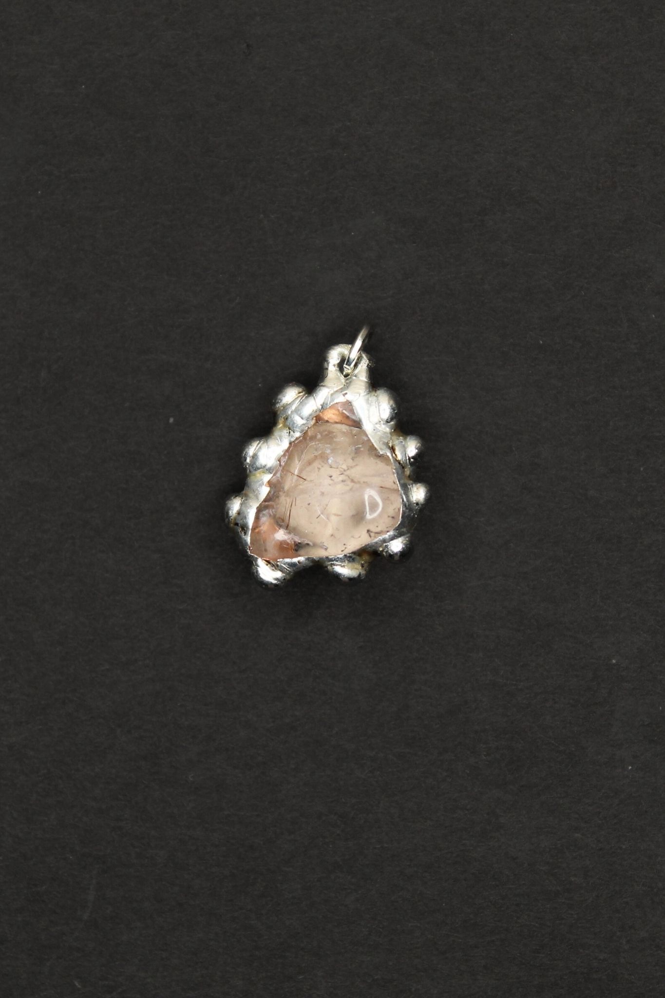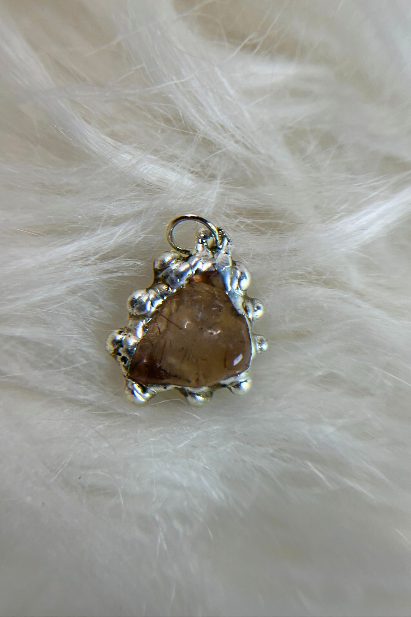 In the middle is a small, triangular stone. The stone has a warm, brown color. Around the stone are small, rounded silver beads. They make the pendant look polished but still natural. Every pendant is a little different because it is handmade. No two are exactly the same.