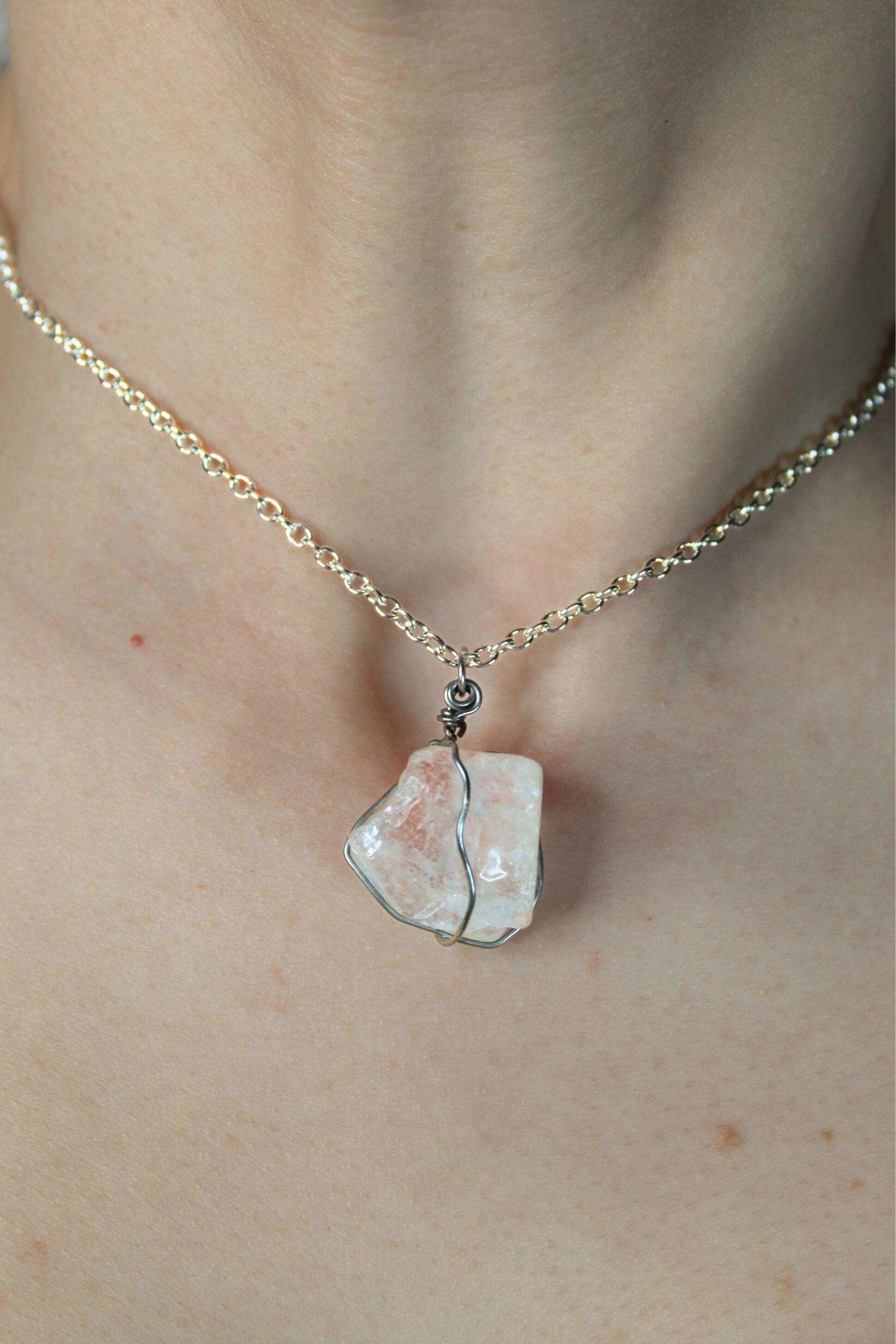 The wire is wrapped in a simple, delicate way. It follows the natural contours of the stone and holds it safely with loops around the edges. At the top, the wire forms a small twisted loop so you can wear it on a chain or cord. Every pendant is a little different because it is handmade. No two are exactly the same.