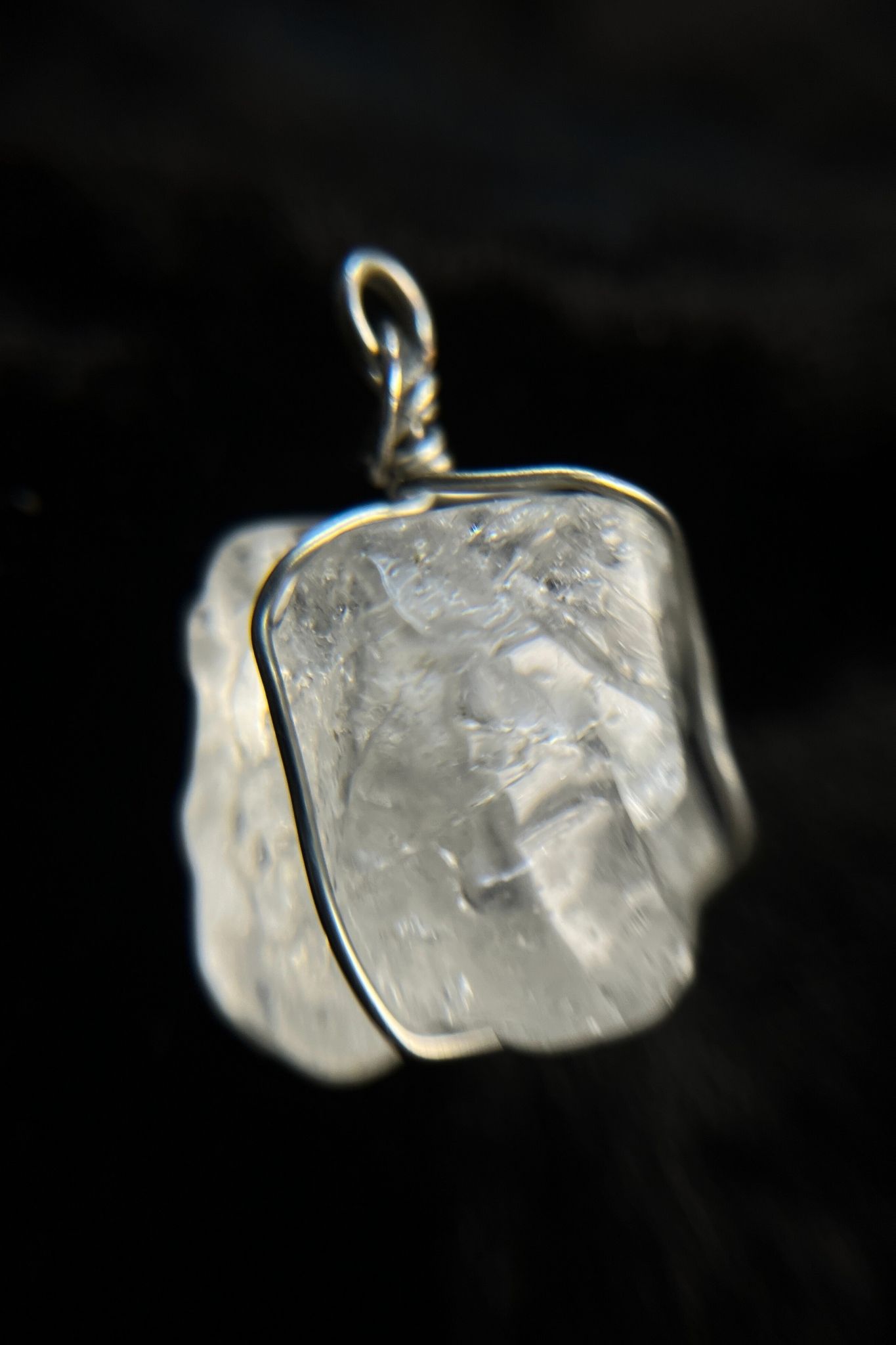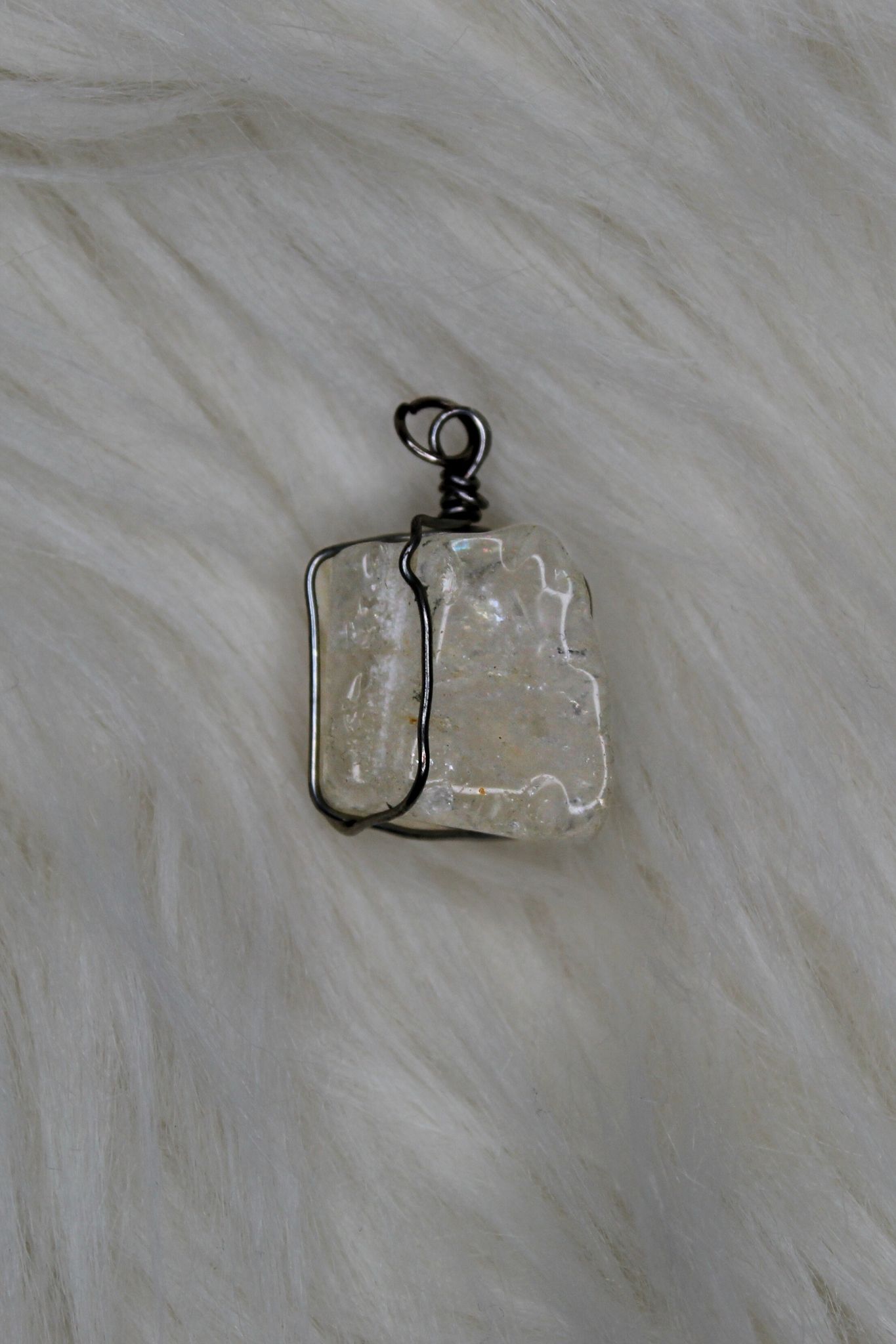 This pendant is handmade by me. I wrap a raw, translucent crystal with silver wire. The stone is slightly frosted and cloudy, and it has a subtle rainbow-like sheen that catches the light. You can see its natural shape and textures.